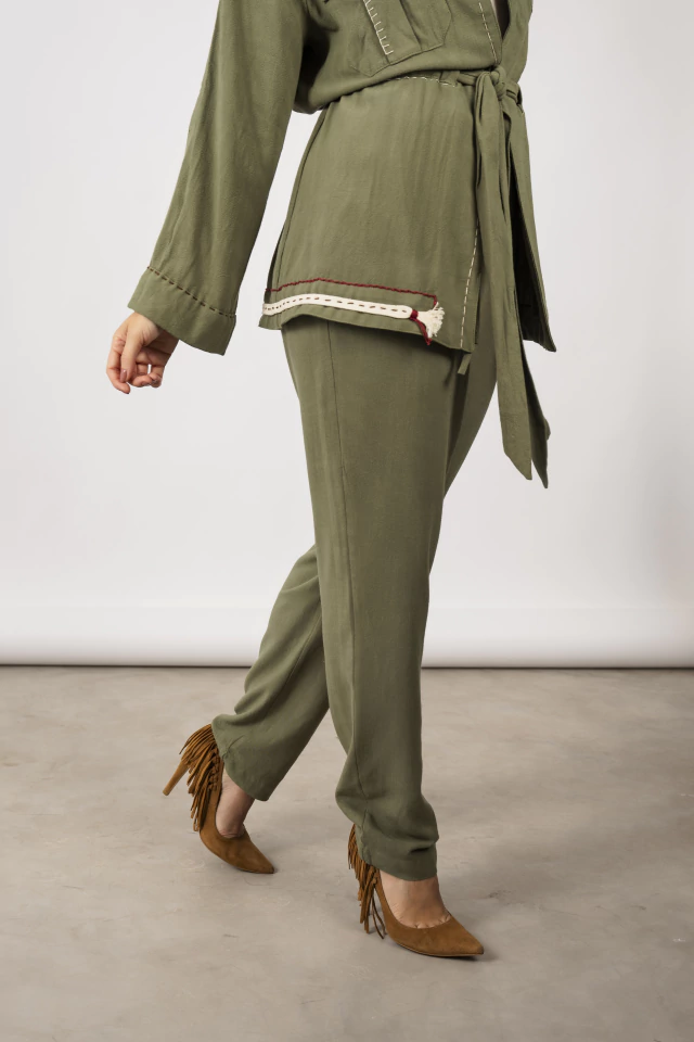 A Calça Mel é mais uma joia da linha Ateliê Simone Franco, onde cada peça é criada com atenção aos detalhes e excelência na escolha dos materiais. Feita em um tecido de blend de linho de altíssima qualidade, em um tom verde militar suave, a calça entrega um equilíbrio perfeito entre estrutura e fluidez, com toque natural e caimento impecável.