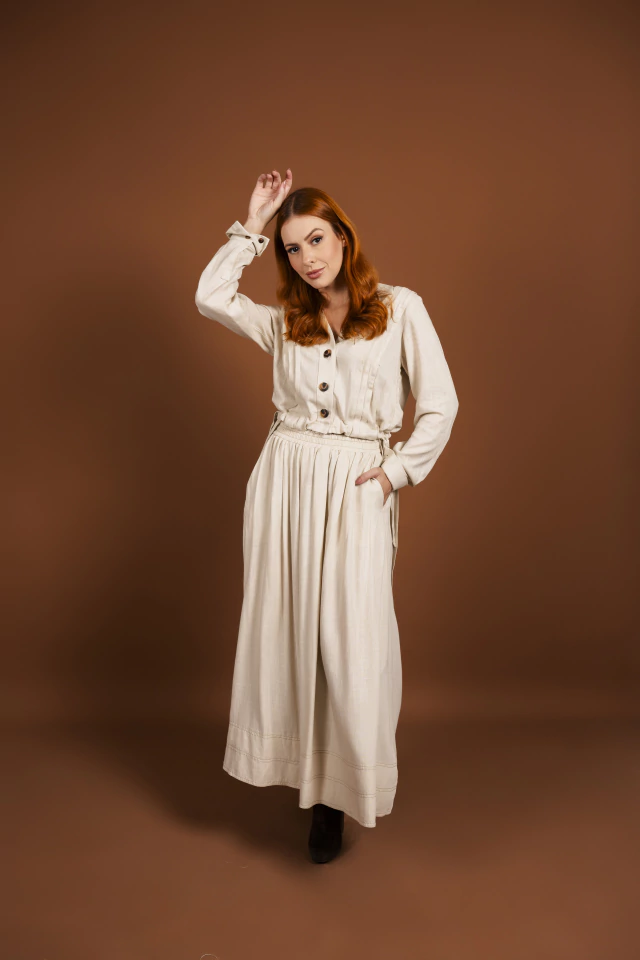 Em tom de linho cru, clássico e sofisticado, a Camisa Lily apresenta gola tradicional, mangas longas e fechamento por botões de madeira, reforçando o cuidado artesanal e o acabamento delicado da peça. O destaque especial fica por conta das nervuras na parte da frente, que acrescentam textura e elegância ao visual. A cintura regulável com amarrações permite diferentes formas de uso, adaptando-se ao corpo com charme e personalidade.