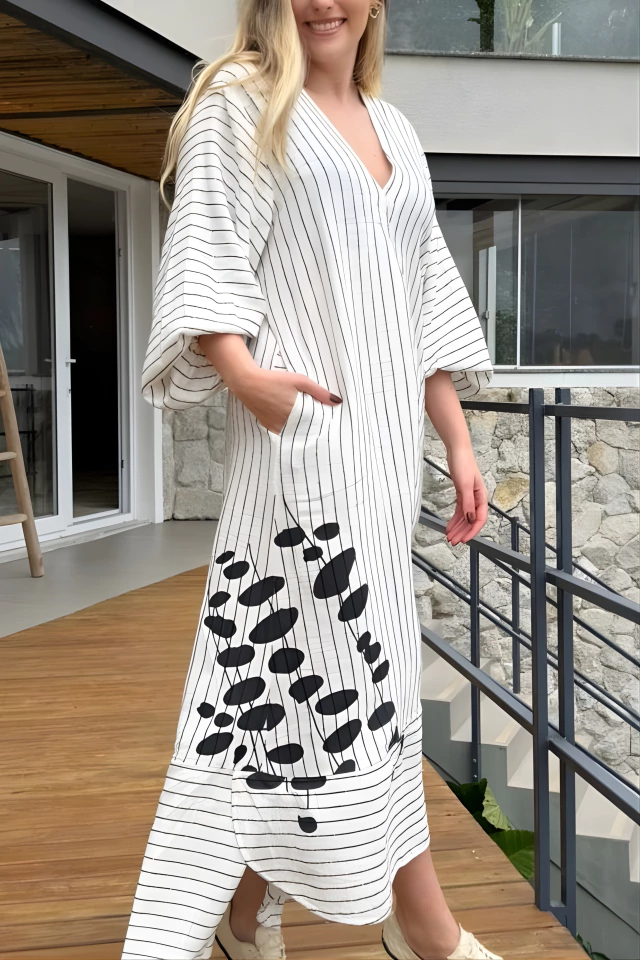 Sua modelagem ampla e alongada, com decote em “V” e mangas generosas, cria um visual leve e imponente. O destaque vai para o bordado de formas orgânicas em preto na barra, que adiciona um toque artístico e contemporâneo à composição.