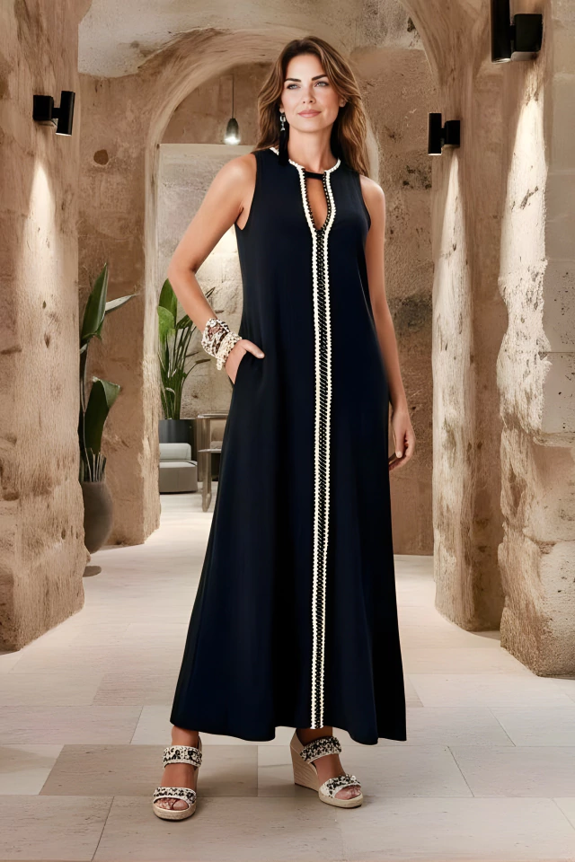 Com modelagem longa e reta, o vestido envolve o corpo de forma suave, valorizando a silhueta com conforto e elegância. O decote em fenda delicada é contornado por um cordão trançado artesanalmente em algodão, desenvolvido especialmente para este modelo. O detalhe, enriquecido por sutis fios dourados, percorre toda a frente — do decote até a barra — criando uma linha visual que alonga e ilumina o vestido com discrição e refinamento.